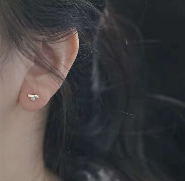 繊細なバーラインの下に、小さなジルコニアがさりげなく輝くミニマルピアス。 無駄をそぎ落としたデザインは、どんなスタイルにも自然に溶け込みます。 シンプルながらも品のある輝きで、耳元に洗練された印象を添えてくれます。 シルバー、ゴールドの2カラーご用意しております。 ゴールドカラーにはSilver925に14Kコーティングを施しております。 サイズ・縦7.4mm 横4.3mm(キュービックジルコニア2.5mm) 素材・【シルバー】地金 silver925/AGP