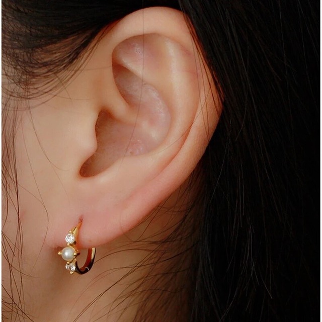 柔らかなシルエットが耳もとに寄り添うSV925ピアス。 ミニサイズのパールとキュービックジルコニアが、洗練されたムードを演出するデザインです。 耳たぶにフィットし、さり気なく存在感を発揮します。 ほのかな抜け感とディテールが、女性らしさもしっかりと取り込み、小ぶりなサイズ感の中に光る、品の良さをお楽しみ頂けます。 キャッチ不要のデザインで、無くす心配がないのもポイント。 シルバー、ゴールドの2カラーご用意しております。 サイズ :外径12mm、内径9mm 重量:1.5g 素材 silver925(ゴールドカラー:K18GP)、貝パール、キュービックジルコニア 2個(両耳)での販売となります。