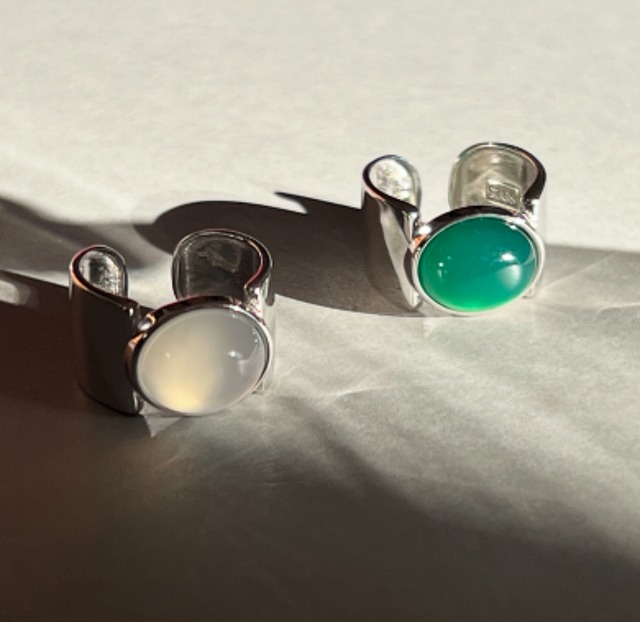 グリーンカルセドニーとホワイトカルセドニーを使用したリング。 1つで十分な存在感を放ち、天然石の重厚感があるもののいやらしい重厚感ではなくクリーンな印象で手元に豊かな表情を与えてくれるジェンダーレスなデザインとなっております。 その日の気分で、デザインの異なるリングと重ねて着用するのもおススメです。 カルセドニーは人との結びつきを象徴する石。優しく癒してくれる石とされているため、人に穏やかに接する事ができ、自分に必要な良縁を運んできてくれます。 精神的に疲れた時に持つと気持ちを楽にしてくれる効果も。 11号〜18号くらいまで幅広いサイズ調整が可能。 素材:地金 silver925/AGP・天然石 リング幅:11.7mm 重量:約5.6g 刻印:S925