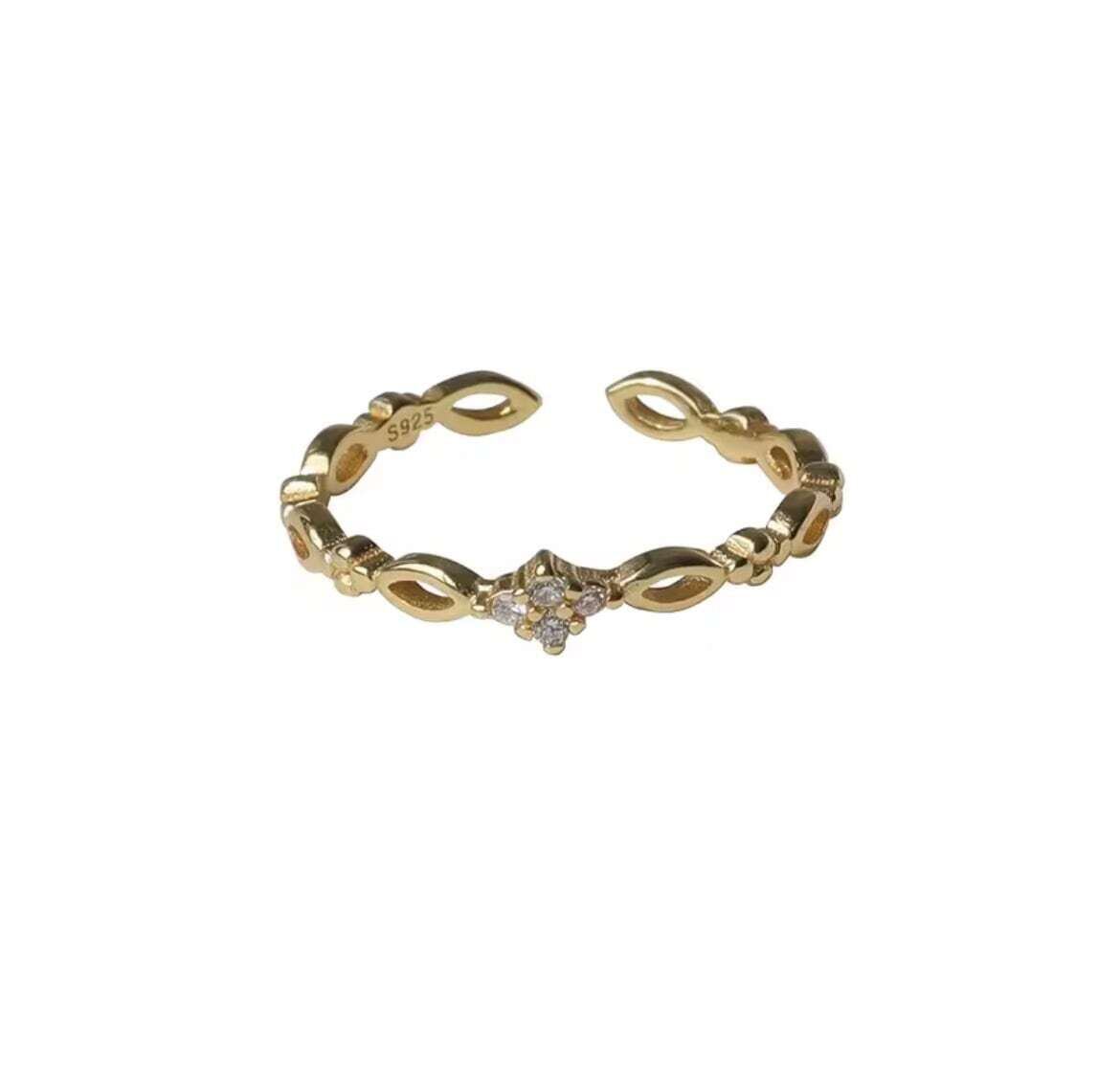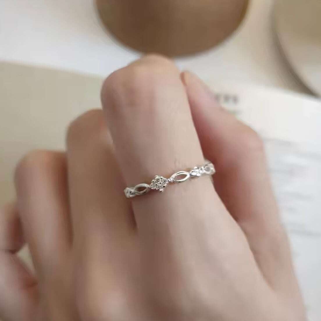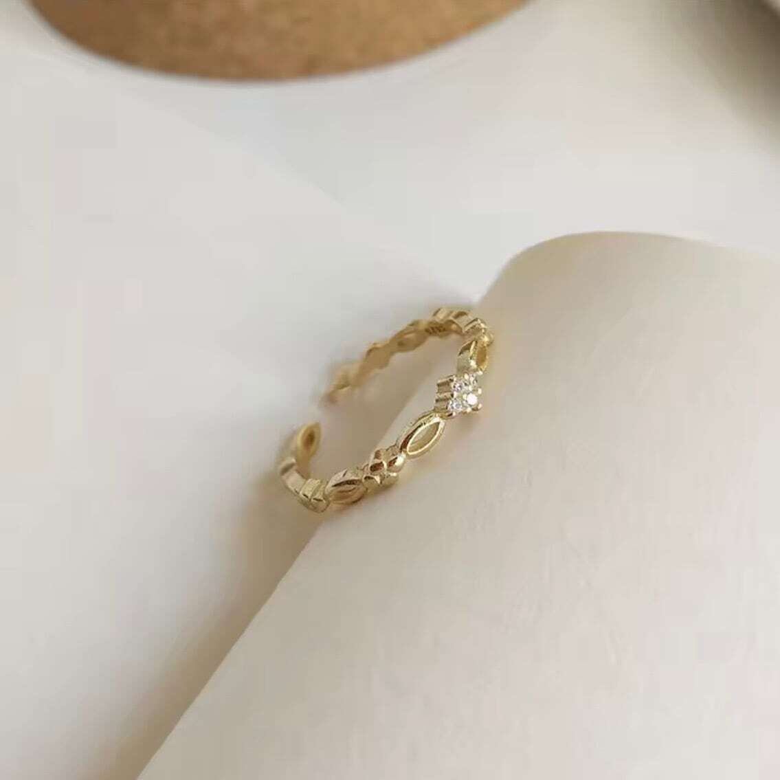 滑らかに連なるリーフモチーフが光を受けて上品にきらめき、指先に気品を添えます。
