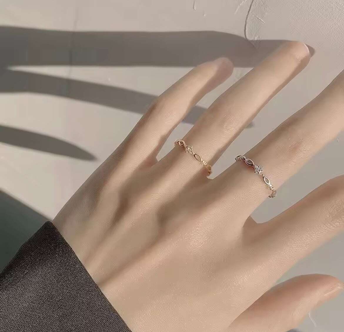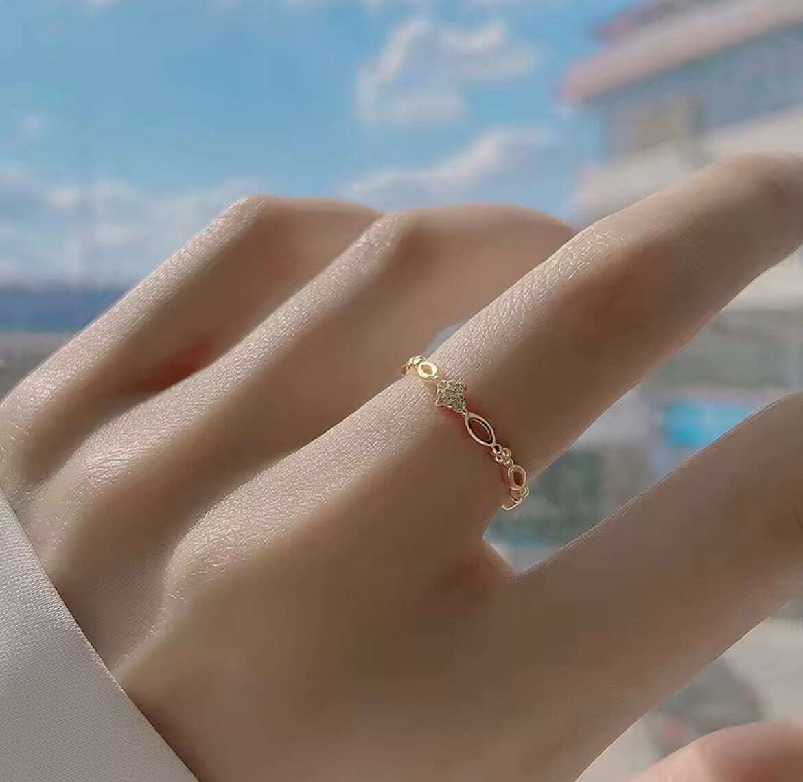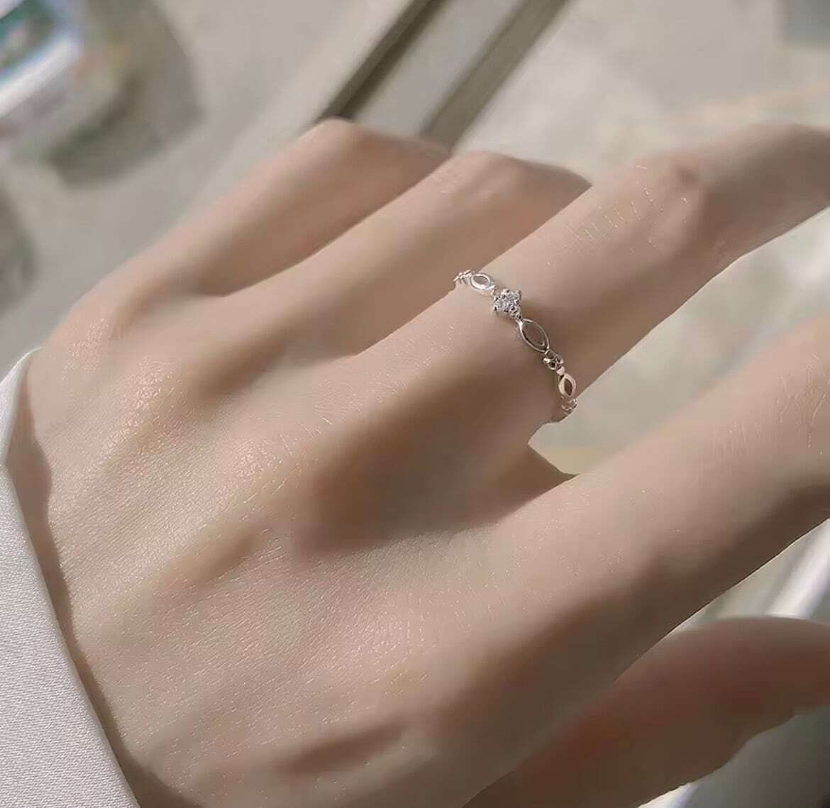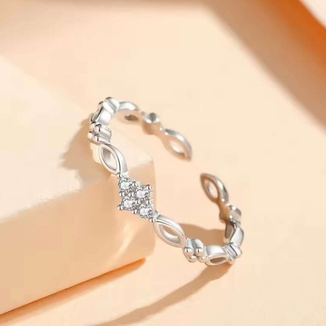 滑らかに連なるリーフモチーフが光を受けて上品にきらめき、指先に気品を添えます。